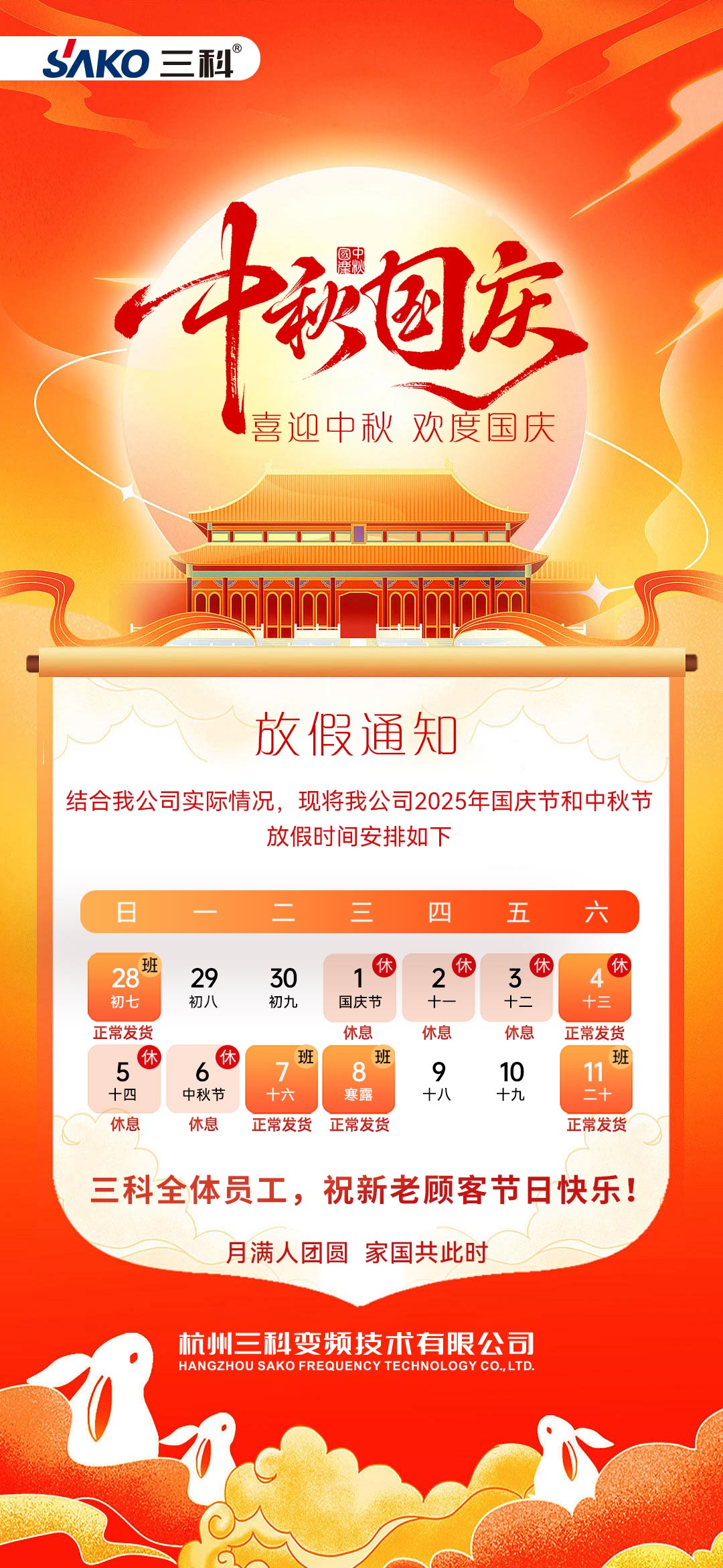 根據(jù)國家法定節(jié)假日安排,結(jié)合公司實(shí)際運(yùn)營情況,杭州三科變頻技術(shù)有限公司2025年中秋、國慶節(jié)放假安排如下: